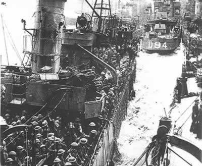 英国一驱逐舰纵队满载英法联军官兵撤退到英格兰1940年5月24日法国北部和比利时境内的近40万英、法、比部队,被迫退到法国北端濒临英吉利海峡的一块狭小的地带敦刻尔克。他们前面是波涛汹涌的大海,后面是穷凶极恶的