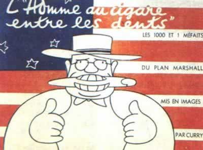 正如这张法国共产党人张贴的宣传画所表明的那样有偏袒的援助会使欧洲分裂第二次世界大战西欧经济遭受巨大损伤,战后恢复和重建十分艰难。1946年底到1947年初罕见的严寒袭击西欧,使西欧经济濒临崩溃。西欧各国为挽救