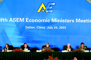 2003年7月24日,亚欧经济部长会议在大连举行隆重的开幕式。7月24日,举世瞩目的第五届亚欧经济部长会议隆重举行。会议通过了《亚欧经济领域主题报告》,达成了《第五届亚欧经济部长会议主席声明》—&mdas