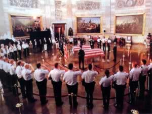 美国国会大厦,对殉职两警员举行国葬。1998年7月24日下午,美国国会大厦像往日一样平静,议员们或在办公,或在开会。来自世界各地的游客络绎不绝。大厦的保安人员则悠闲地散着步。15时40分,一名中年白人男子出现在