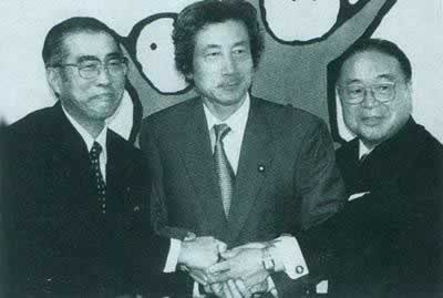 小渊惠三(左)、小泉纯一郎(中)和尾山静六(右)在一起1998年7月24日,日本外相小渊惠三在自民党众参两院议员大会上,以225票的绝对优势战胜前内阁官房长官尾山静六和现任厚生大臣小泉纯一郎,当选自民党第18任总