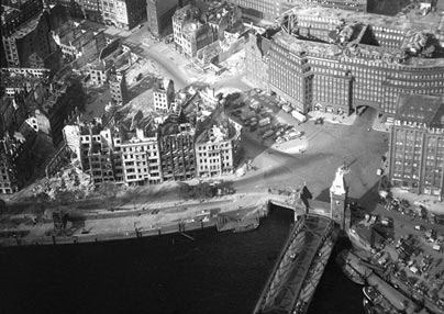 空袭后的汉堡市1943年7月24日,英国空军开始实行『罪恶之城』计划,首次白天大规模空袭汉堡。轰炸行动持续到11月份,英联邦空军投掷了大约九千吨炸弹,三万人在空袭中丧生,28万幢建筑被毁。