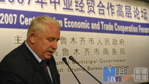 7月8日,吉尔吉斯斯坦首都比什凯克市副市长伊利亚·彼得洛维奇·克里明科正在作主旨发言。7月8日,一位来自哈萨克斯坦的代表正在介绍本国商务情况。2007年7月8日上午,『2007中亚经贸