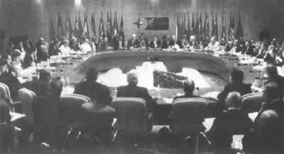 马德里北约首脑会议会场1997年7月8日,北约首脑会议在西班牙马德里的市政议会大厦举行。16个成员国的国家元首和政府首脑经过5个多小时的讨价还价,决定『邀请捷克、匈牙利和波兰同北约开始就入盟问题进行谈判』,最