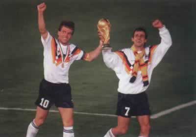 德国队队长马特乌斯与队友利特巴尔斯基高举大力神杯欢呼1990年7月8日,第十四届世界杯足球赛决赛在罗马举行,由联邦德国队对阿根廷队,这场比赛被认为是世界杯历史上最不精彩的决赛之一。阿根廷队无法组织有效的进攻