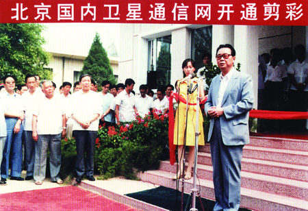 时任国务院副总理李鹏为国内卫星通信网开通剪彩并发表重要讲话经过两年的努力,我国国内卫星通信网于1986年7月8日正式建成。通信卫星是利用位于地球赤道上空3.6万公里高处的同步卫星作中继站,实现区域通信的现代化
