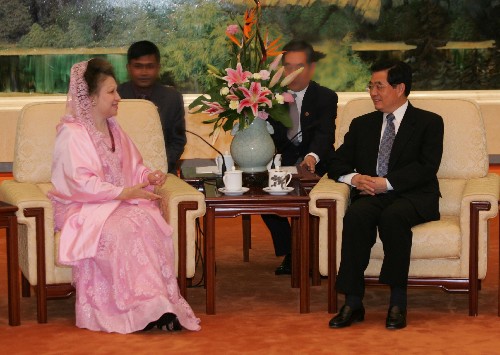 2005年8月18日,胡锦涛会见孟加拉国总理。国家主席胡锦涛18日下午在人民大会堂会见了孟加拉国总理卡莉达·齐亚。胡锦涛说,中孟建交30年来,在和平共处五项原则基础上,两国关系健康顺利发展。双方相互
