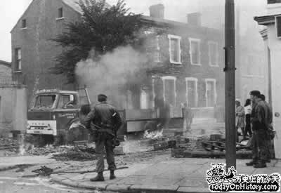 英国军队查勘巷战之后的贝尔法斯特街区1971年8月25日,当英国政府行使紧急状态权力,对爱尔兰共和军中的一些可疑领导人实行预防性禁闭后,北爱尔兰发生了暴乱。首相布赖恩-福克纳声称,这些紧急措施对于保护北爱尔兰