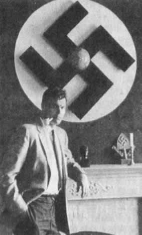 公开亮相的种族主义者洛克威尔1967年8月25日,美国纳粹党首领乔治-林肯-洛克威尔在弗吉尼亚州的阿灵顿遭一名枪手袭击,死于非命。洛克威尔的前助手约翰-帕德乐因该谋杀案而受到起诉。在给白色和深色皮肤的纳粹党徒之