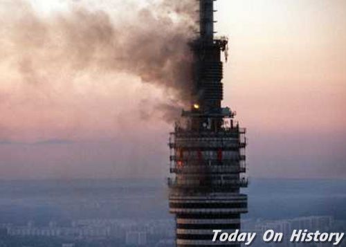 2000年8月27日,俄罗斯莫斯科奥斯坦金诺电视塔发生大火。位于莫斯科市区北部的奥斯坦金诺电视塔450米处发生火灾,据初步查明的原因是电缆短路。莫斯科消防人员正在全力救火,电视塔内人员紧急疏散后,目前尚