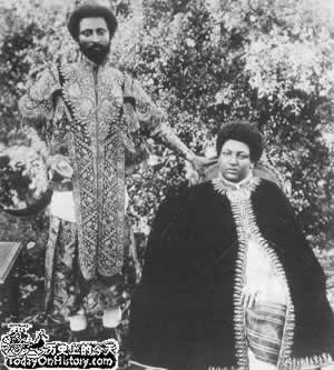 身穿华丽皇袍的埃塞俄比亚新皇帝海尔·塞拉西(1892-1975)与他的妻子梅嫩皇后新婚后的合影1975年8月27日,埃塞俄比亚皇帝海尔-塞拉西一世逝世。海尔-塞拉西一世原名塔法里-马康南,1892年7月27日生于埃塞俄比