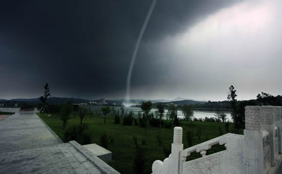 2009年8月3日,栖霞市境内的长春湖面上出现『龙吸水』景观。2009年8月3日16时许,位于山东栖霞市境内的长春湖面上,突然腾起一条参天水柱,顷刻间大雨倾盆。据烟台市气象局专家解释,这一壮景实为龙卷风所致。龙卷风