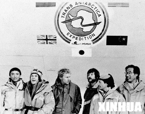1989年8月3日,国际横穿南极大陆考察队到达南极的乔治王岛。这是当时由中、日、美、法、苏、英6国6人组成的考察队在南极乔治王岛的合影。这支探险队1989年7月26日离开中国南极长城站,经过5984公里的跋涉,对