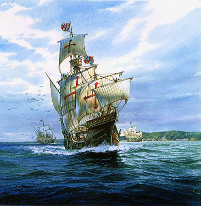 『圣玛利亚』号为首的哥伦布探险船队哥伦布1492年8月3日,意大利航海家哥伦布(1451—1506年)终于实现了航海计划,率领由3艘帆船组成的船队,在太阳还未升起的清晨,从西班牙的巴罗斯