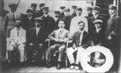 孙中山等人由上海经台湾赴日本时在轮船上留影1913年8月4日,孙中山、胡汉民一行,由福州马尾乘日轮抚顺丸去基隆,5日从基隆换乘日轮信浓丸赴日本。9日到达神户,18日转抵东京。黄兴继孙之后,于27日到达东京,化名