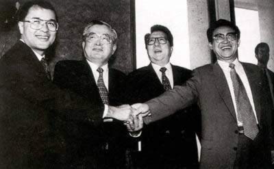 参加首次预备会议的四方代表1997年8月5日至7日,中、美、朝、韩四国代表在纽约哥伦比亚大学校园内举行朝鲜问题四方会谈首次预备会议。这是自1953年朝鲜停战协定签字以来四方代表第一次坐在一起讨论朝鲜半岛的和平问
