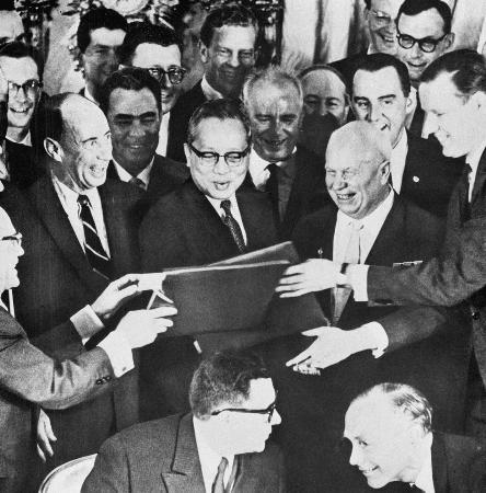 苏美关于1963年8月5日在莫斯科正式签署了《禁止在大气层、外层空间和水下进行核试验条约》。苏联领导人赫鲁晓夫、勃烈日涅夫出席了签字仪式。联合国秘书长吴丹也应邀出席了签字仪式。在条约上签字的是苏联外交部长葛