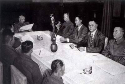 蒋介石召集『中央改造委员会』开会的情景,正面右起:蒋经国、张其昀、张道藩、陈诚、蒋介石。1950年8月5日,国民党中央改造委员会在台北成立,通过《中央改造委员会组织大纲》,蒋介石任该委员会主席,张其昀为秘