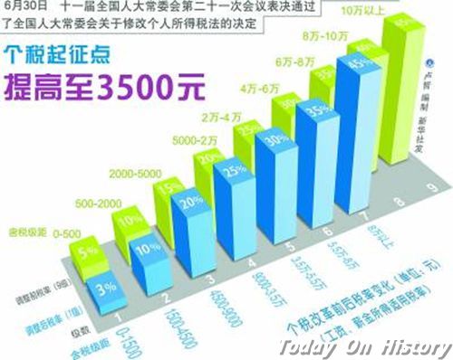 2011年9月1日,我国个税起征点从2000元上调至3500元。十一届全国人大常委会第二十一次会议表决通过了全国人大常委会关于修改个人所得税法的决定,根据决定,个税起征点将从现行的2000元提高到3500元。财