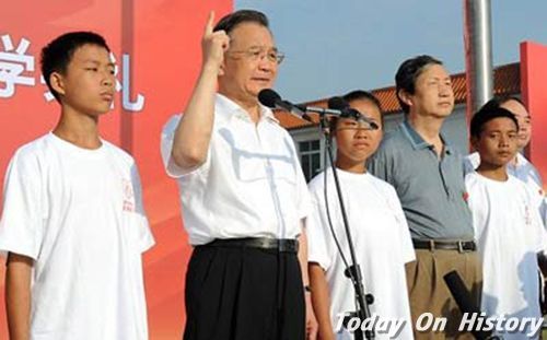 2008年9月1日,温家宝出席北川中学开学典礼。正在四川地震灾区考察的国务院总理温家宝一大早就来到设在四川长虹集团培训中心的北川中学临时学校,参加正在这里举行的秋季开学典礼。『请肃立,出旗!』4