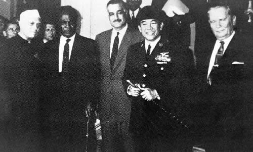 左起:印度总理尼赫鲁、加纳总统恩克鲁玛、埃及总统纳赛尔、印度尼西亚总统苏加诺、南斯拉夫总统铁托。万隆会议之后,亚非民族解放运动进一步高涨,新老殖民主义者之间的矛盾日趋尖锐,苏联也开始同美国争夺亚非拉广
