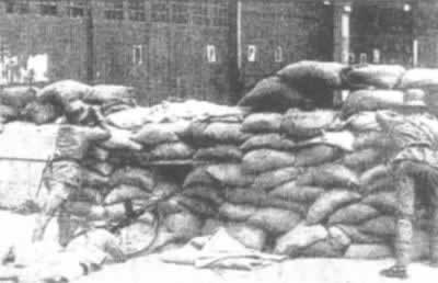 守军在马路上布设沙包工事,与敌巷战1937年9月1日,吴淞失陷,日军登陆攻占杨树浦。9日,淞沪战场中国军队营长姚子青率部500,死守宝山,经激烈巷战,该营将士全部牺牲。11日,日军下令派第九、第十三、第一0一师