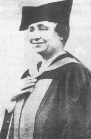 海伦-凯勒获英国格拉斯哥大学荣誉博士学位后留影1904年9月1日,海伦-凯勒小姐在与不幸所作的斗争中,用人的意志和教育的威力获得了胜利,于今天光荣地毕业于拉德克利夫学院。凯勒小姐1880年生于亚拉巴马州塔斯坎比亚