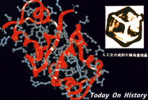 人工合成胰岛素1965年9月17日,中国科学院生物化学研究所等单位经过6年多的艰苦工作,第一次用人工方法合成了一种具有生物活力的蛋白质———结晶牛胰岛素。胰岛素的人工合成,标志着人类在揭开