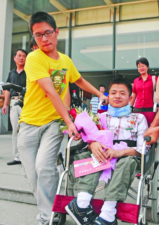 9月18日,一同跨进大学校门的李阳,又一如既往地抱着、搀着『玻璃人』翁建光报到暑假中,李阳常坐一个多小时公交车来光光家里,帮他穿衣,陪他看书、复习功课。高中时,上课在一起,活动在一起,同学们都亲切称他们