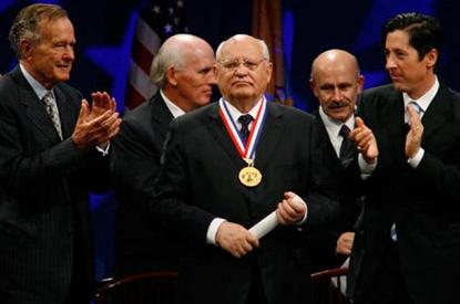 戈尔巴乔夫2008年9月18日,美国国家宪法中心,美国前总统布什向前苏联总统戈尔巴乔夫颁发『自由勋章』。已经风烛残年的前苏联总统戈尔巴乔夫,在俄罗斯早已不受关注了。有意无意的,人们总希望忘记这个名字