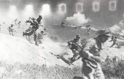 志愿军向敌人发起攻击1952年9月18日,为配合在板门店进行的朝鲜战场停战谈判,在谈判中争取主动地位,中国人民志愿军举行全线性的战术反击作战。采取的主要手段是:以军为单位,选定若干敌人连排支撑点和个别的营防