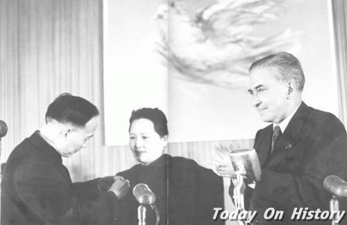 图为郭沫若给宋庆龄佩带勋章右为爱伦堡1951年9月18日,宋庆龄接受『加强国际和平年』斯大林国际奖金,典礼在北京举行。宋庆龄决定将奖金十万卢布全部献出,作发展我国儿童和妇女的福利事业之用。