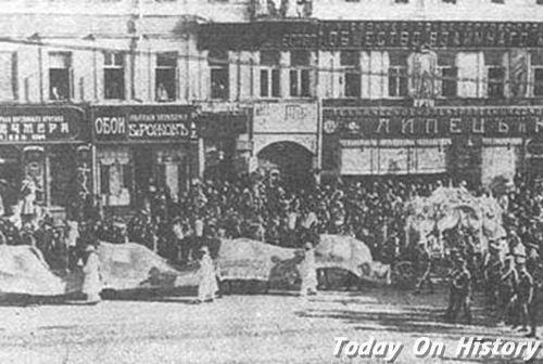 圣彼得堡参加斯托雷平葬礼的人群1911年9月14日晚上,斯托雷平被刺杀,肺部和脊椎严重受伤,难以抢救,于9月18日晨死去。这一刺杀事件完全发生在沙皇尼古拉二世的视野之内,凶手是社会党人迪来特里,是位律师。