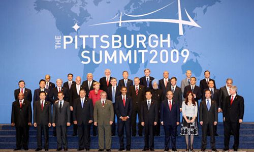 与会各国领导人及有关国际组织负责人集体合影2009年9月24日,二十国集团第三次峰会在美国匹兹堡举行。会议在国际金融机构改革治理结构方面取得重大突破。与会领导人同意将国际货币基金组织和世行两大机构的
