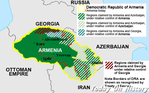 亚美尼亚民主共和国1919年1920年9月24日,亚美尼亚民主共和国对土耳其宣战,土亚战争爆发。此时土耳其革命者称位于亚美尼亚民主共和国内的土耳其人被虐待和镇压。亚美尼亚民主共和国是历史上第一个现代化的
