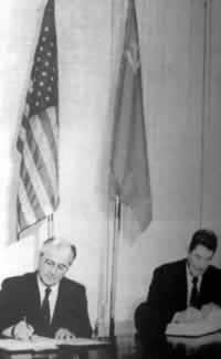 1987年12月8日下午2点02分(美国东部时间),美国总统里根和苏联领导人戈尔巴乔夫在白宫东厅签署了全部销毁两国中程和短程核导弹条约。这是美国总统里根和苏联领导人戈尔巴乔夫在华盛顿举行他们3年来的第3次会晤。这次会晤也是战后美苏首脑举行的第14次会晤。