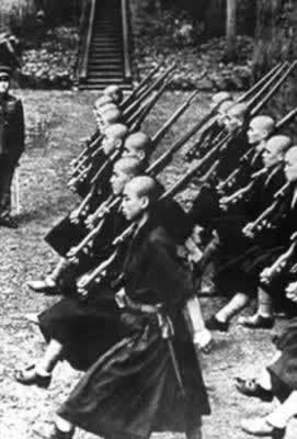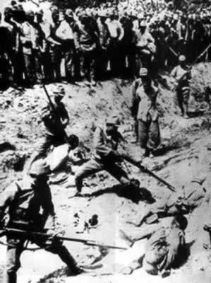 在刽子手的狰狞一笑之下,将要被杀的中国平民在做最后的祈祷