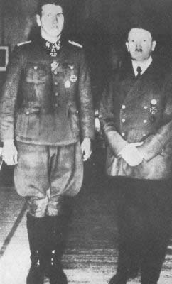 站在希特勒身边的是他的部下奥托·斯科采尼,这位纳粹军官曾因在1943年营救过墨索里尼而出名。在阿登反攻战中,他指挥约800名能说英语、身穿美军制服的德国士兵渗透到美军防线后面进行骚扰,使美军一度陷于混乱。