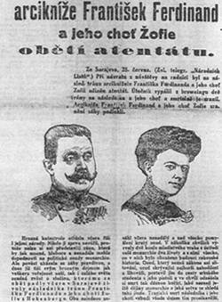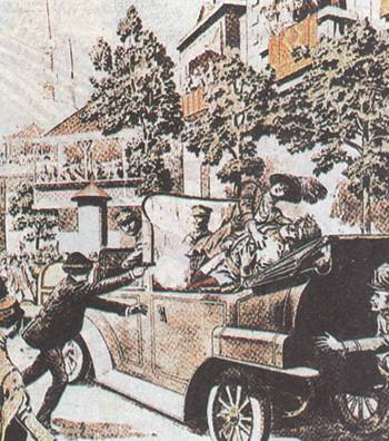 大公刚刚探望了在这天的早些时候被几乎夺去他生命的炸弹炸伤的受害者,这时突然从人群中冲出加夫里洛-普林西普,并 向他和他的妻子索菲-冯-霍恩伯格射出两颗致命的子弹。