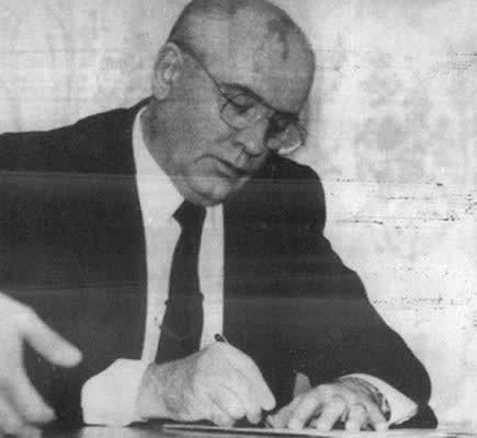 戈尔巴乔夫在辞职书上签字后发表了12分钟电视讲话:『我曾经坚定地赞成保持联盟国家,保持国家完整。最近发生的事件却朝另一个方向发展,国家分裂解体已成为现实,我不能同意发生这一情况......』
