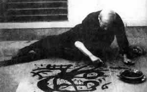 70年代初仍处在艺术颠峰期的米罗,席地『指』画,绘画方法不拘形式,创作达到炉火纯青的程度。