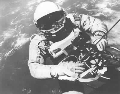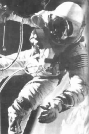 爱德华·怀特成为第一位在太空漫步的美国人东西方不断加快的空间竞争又经过了一个里程碑。1965年3月18日苏联宇航员阿列克谢-列奥诺夫成为第一个太空行走者。三个月后,被约翰逊总统斥责为『落在别人屁股后』的