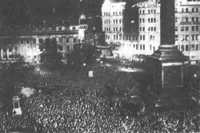 人群簇拥在伦敦特拉法加广场等待选举结果1929年6月10日,新当选的英国首相拉姆齐-麦克唐纳在唐宁街10号外面的草坪上介绍了新工党内阁,为此他再度名垂史册。内阁中有一名女成员,这在历史上还是第一次。首相在麦克风