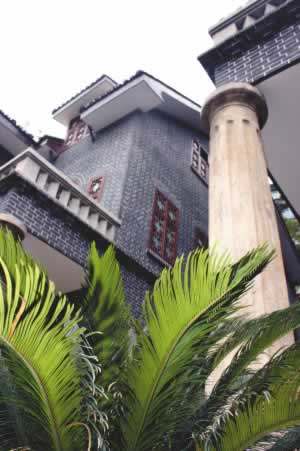 当时的特园,又称『鲜宅』,包括达观楼、平庐和康庄三部分。达观楼是特园的主体部分,既为主人斋名也表达主人性格,由鲜英先生的夫人自己设计,是一幢青砖饰面的中西式三层楼房,雄踞山头,矗立在各种各样的树木花草之间,嘉陵江卧流山下。主楼前后有两个大花园,花园旁边有一排平房和一个小院。楼内有主人的书斋、客厅和卧室等,居室宽敞,错落有致,俯瞰嘉陵江,波光岚影,景色宜人,令人有超尘拔俗之感。二曰平庐,以鲜英第八个女儿鲜继平的『平』字定名。三曰康庄,以鲜英九女鲜继康的『康』字取名,为四幢三层楼房,两两相连,每组对称,分别编号为一、二、三、四号楼。
