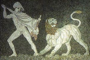 亚历山大正在与他的朋友克拉特鲁斯一起和一头狮子拼斗〈此为局部图片〉。