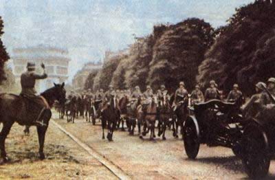 1940年6月14日,对法国人来说,他们所热爱的巴黎今夜再也不是不夜城了。这天当德军从纽利进入巴黎市中心时,巴黎笼罩在一片黑暗之中。德军的坦克穿过协和广场,德军装甲车从爱丽舍宫的绿树浓荫下隆隆驶过。在公众场合,法国男女失声痛哭。巴黎城大部分空荡荡。4天前当政府打点东西奔往图尔时,200万巴黎居民也纷纷逃出巴黎。
