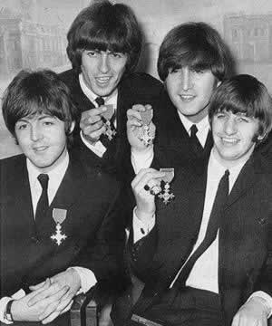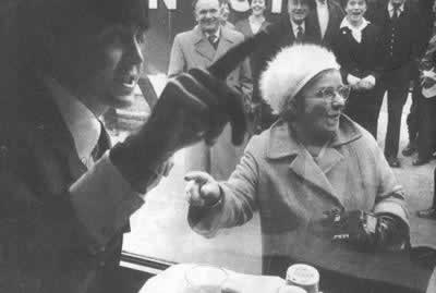 在白金汉宫门口,即将领取勋章的保罗-麦卡特尼兴奋异常,列侬为他拍了这张快照车外是一个打算留影的『披头士』迷。