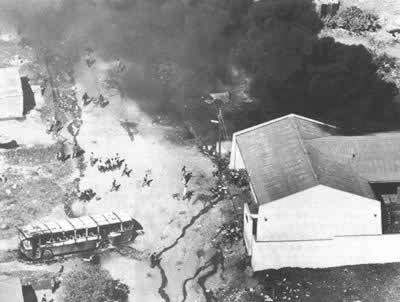警察在直升机上投掷催泪瓦斯以驱散人群