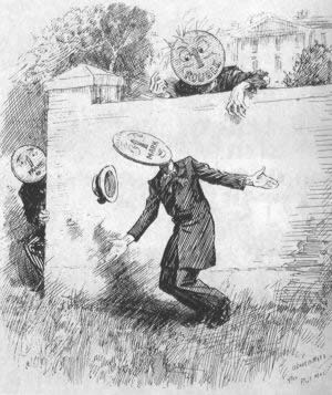 《笨拙》杂志后幅漫画展示了『货币汇兑避难所』的情景。漫画中疲软无力者为马克,趴在墙头上的是卢布,在一旁偷窥者是法郎