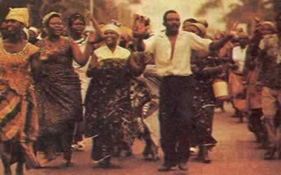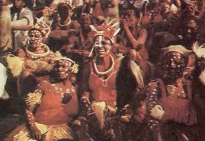 欢欣鼓舞的部落妇女们,涂着节日的斑斓色彩庆祝刚果独立